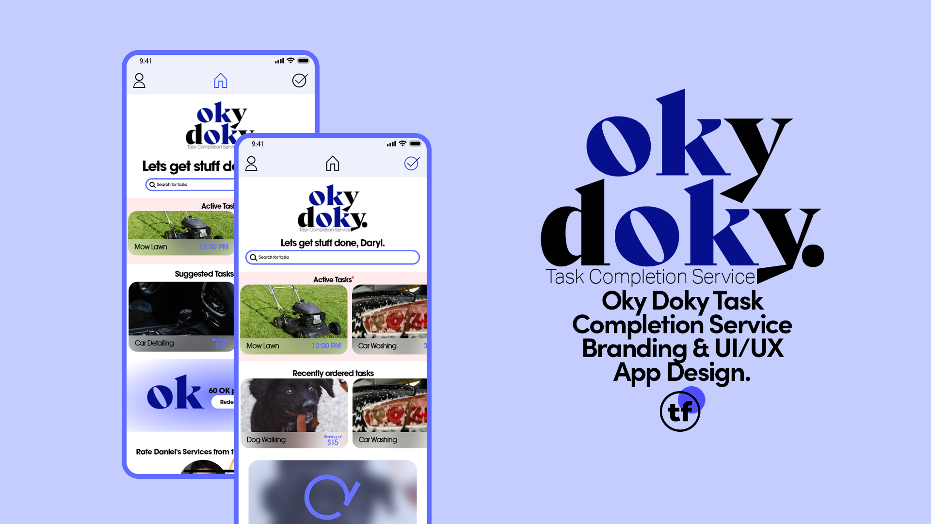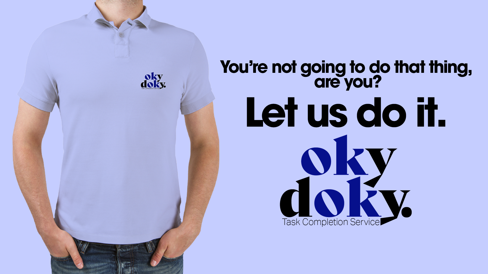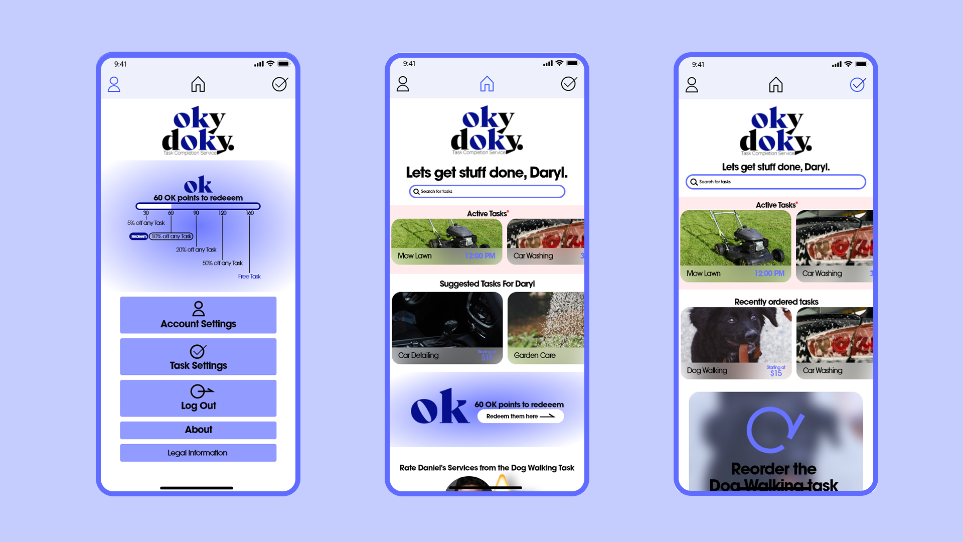 Branding and app design for fictional company Oky Doky. The app design focuses on getting the user the services they need as quickly and promptly as possible. Disclaimer: Oky Doky is a fictional company. Any correlations to real companies or products are coincidence.